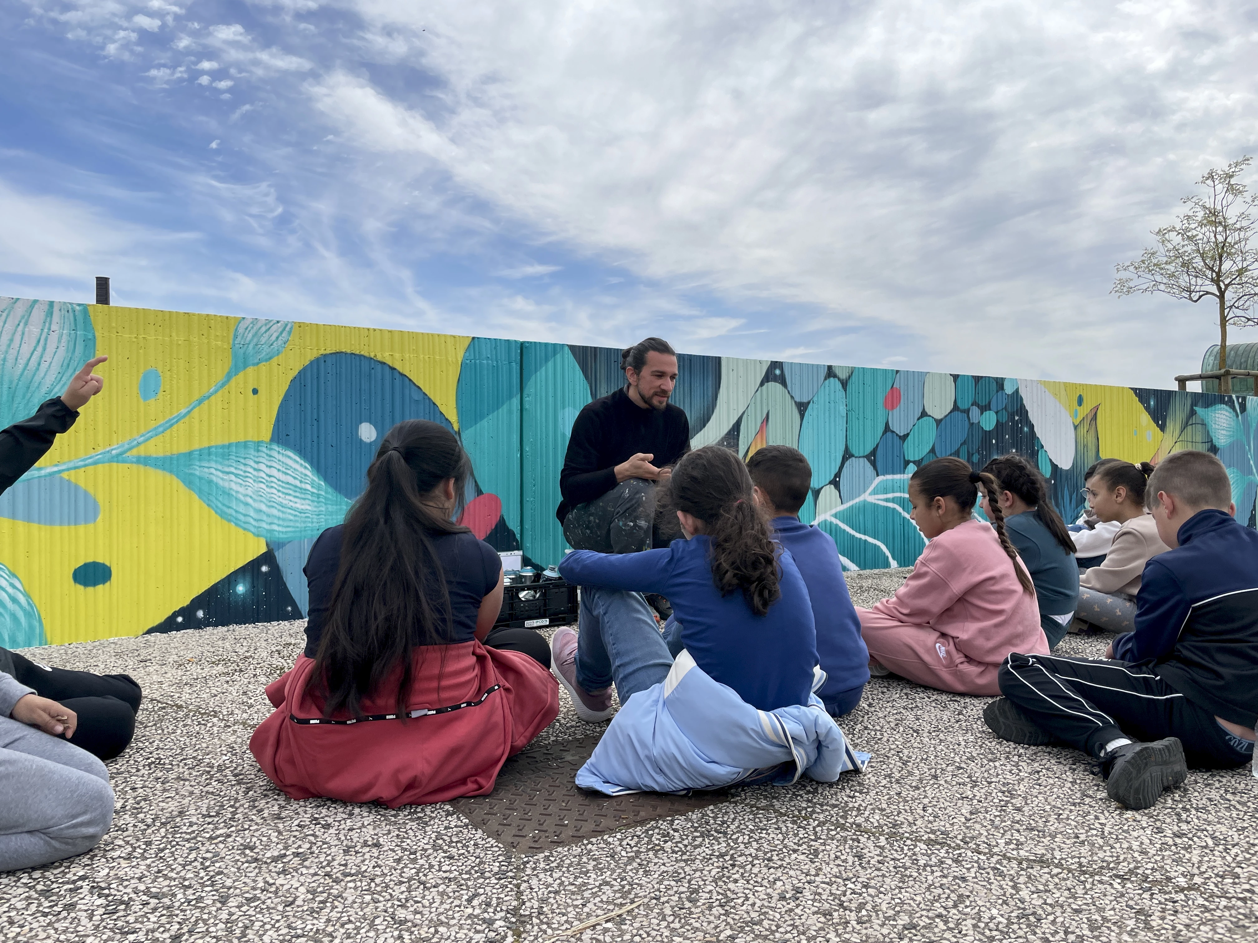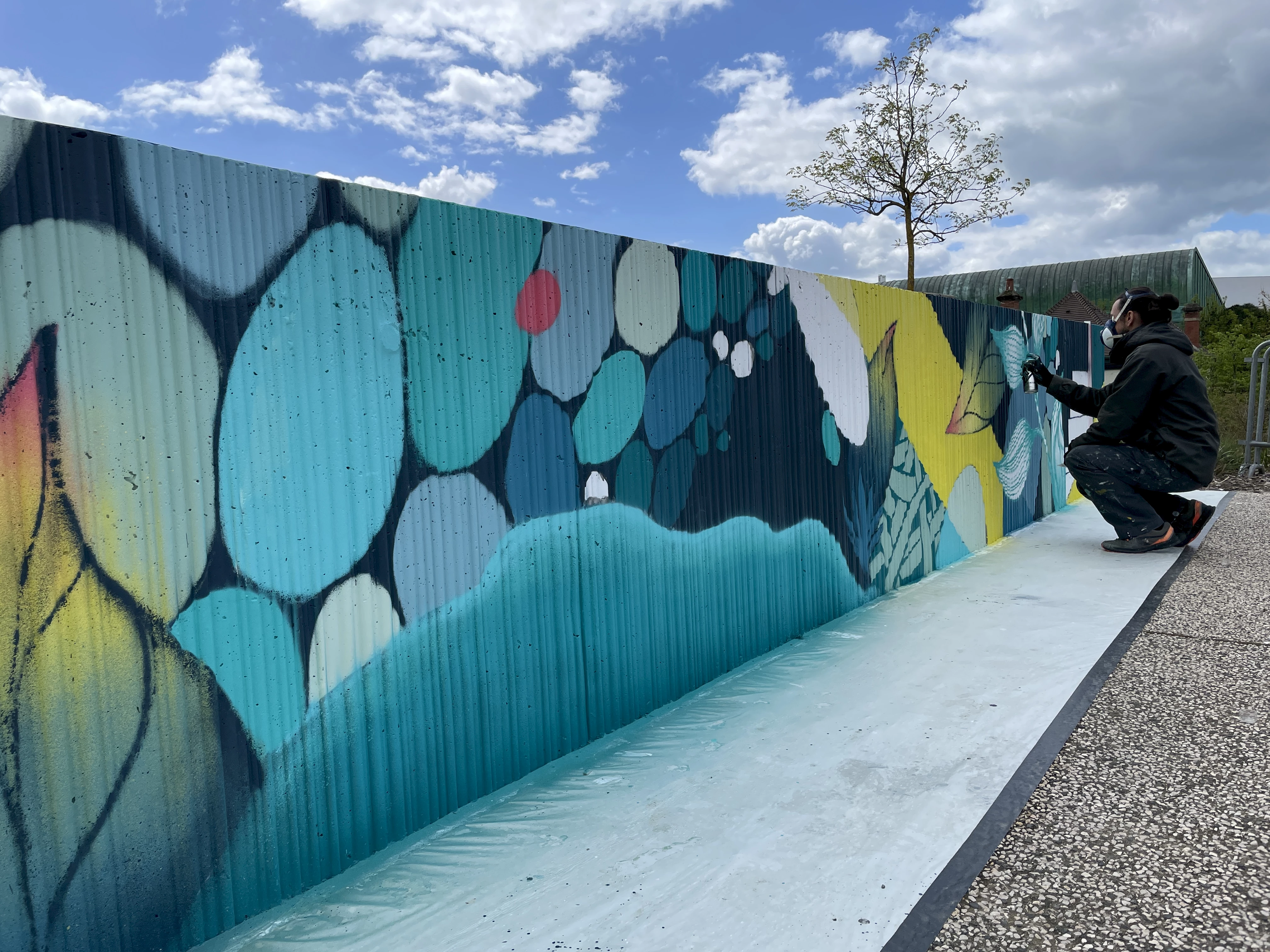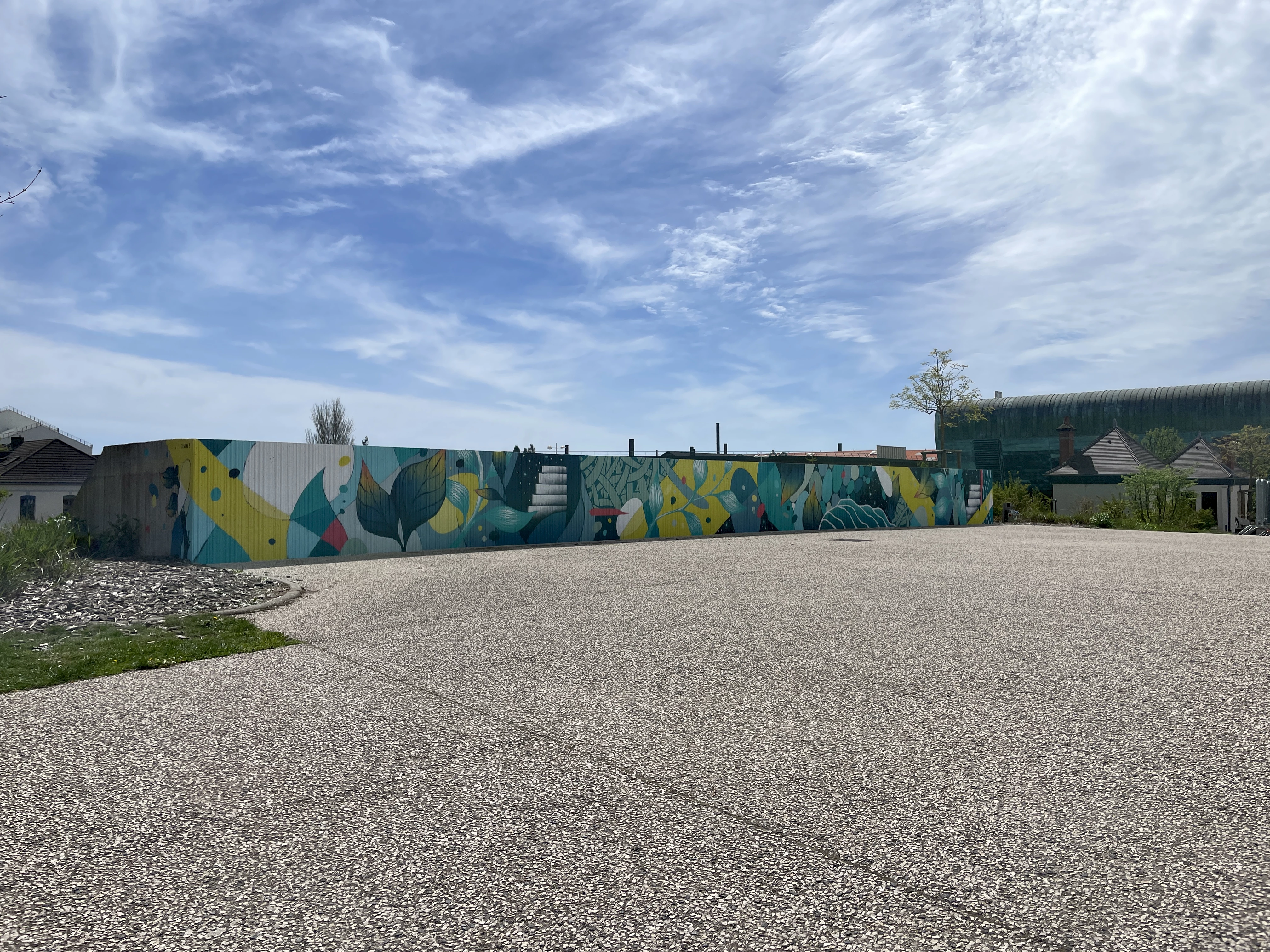 Dans le cadre de sa politique culturelle particulièrement dynamique, la Ville du Creusot a souhaité investir l’espace Simone Veil, lieu de passage menant vers le centre-ville et situé à proximité de l’Arc – scène nationale – et du conservatoire. Entre les fresques de Pastel et Agrume réalisées en 2023, la fresque Murmure de Jordan Harang propose une nouvelle lecture de l’espace public, transformant un simple lieu de transit en un espace propice à la pause et à la contemplation.