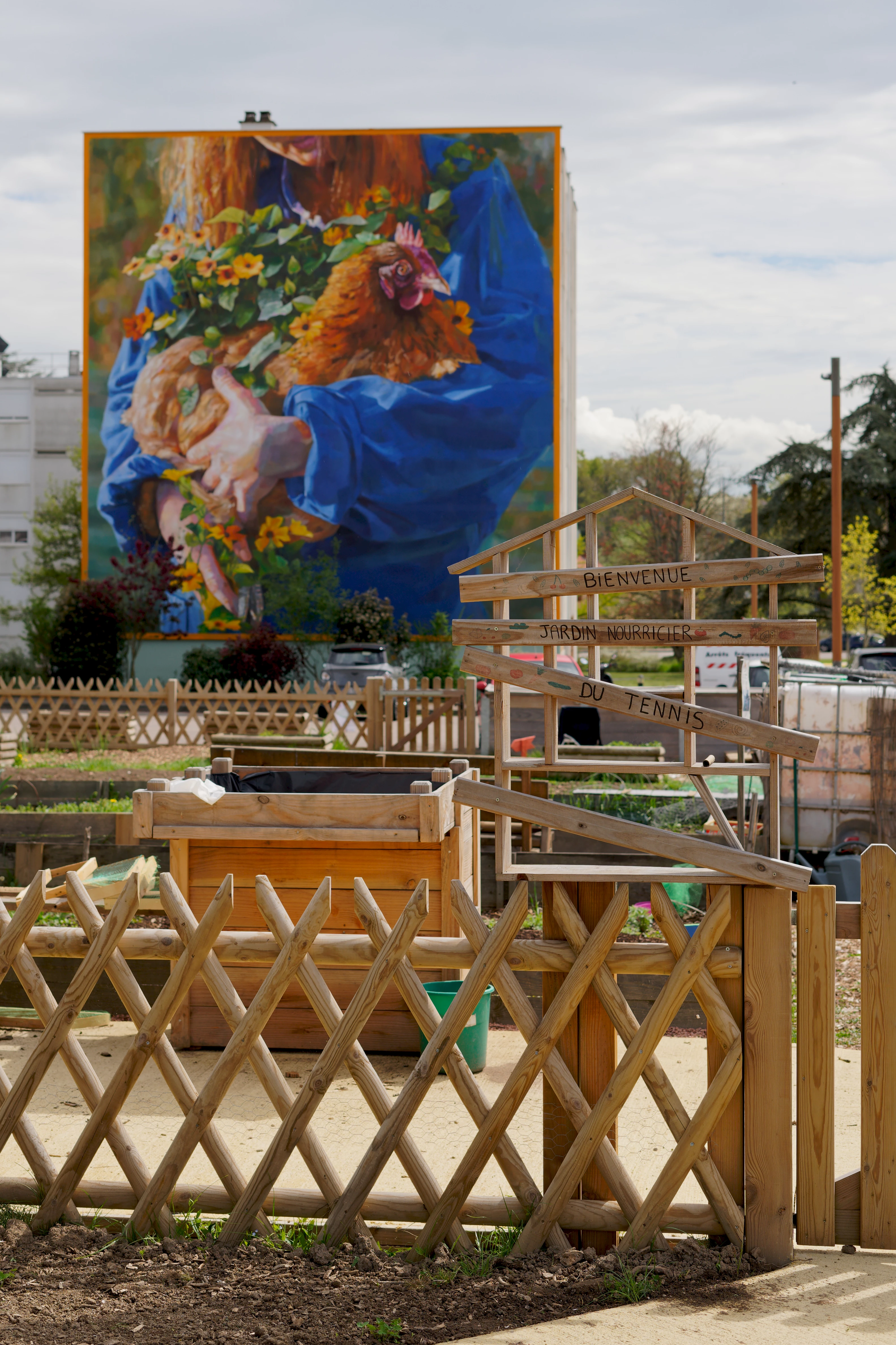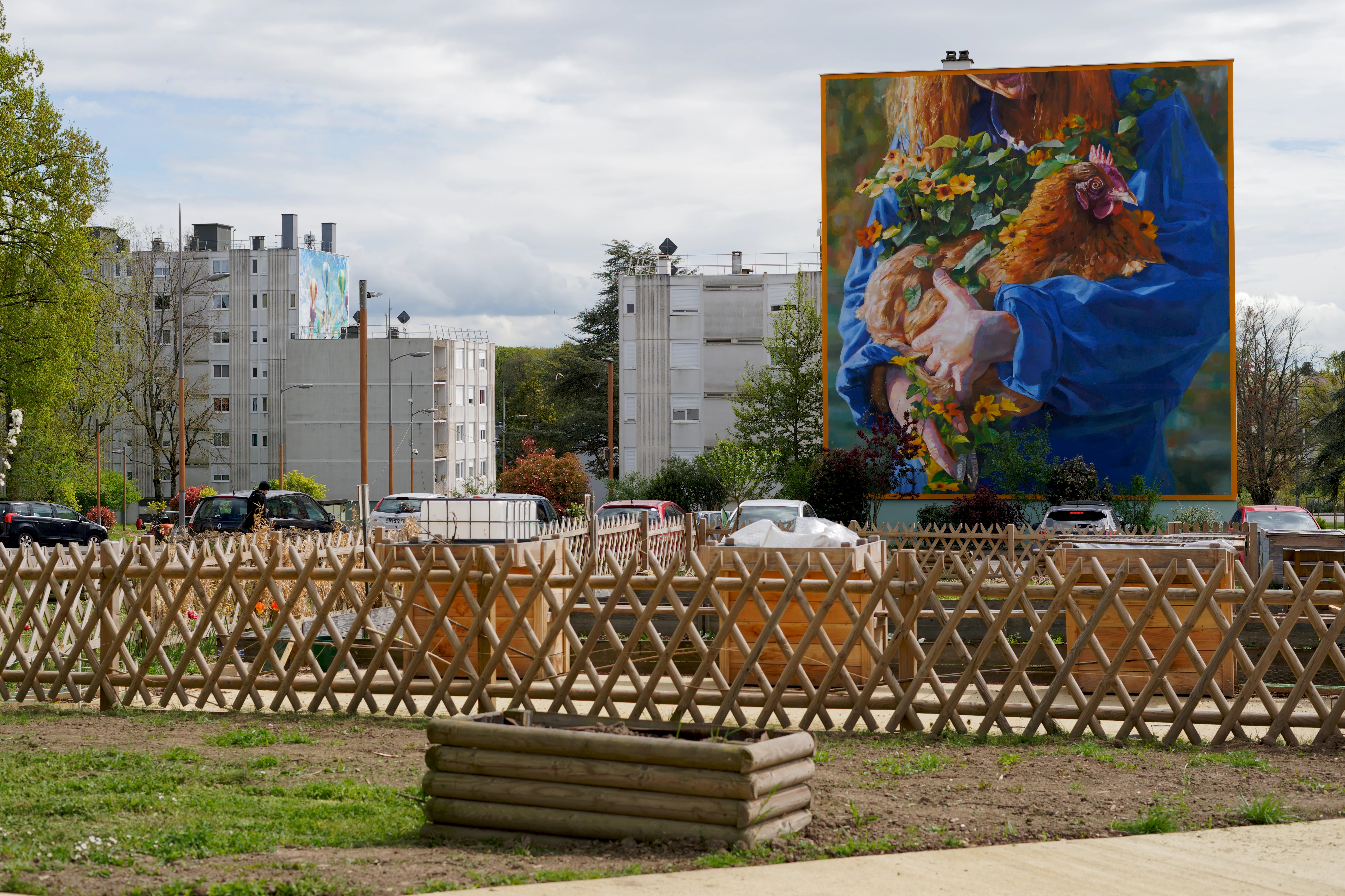 Face au jardin nourricier, l’artiste a peint une scène d’amitié entre l’humain et l’animal. Cadrée de façon serrée, une poule est tendrement portée par une jeune femme vêtue d’un bleu de travail. Cette scène intense nous parle de l’importance de notre relation avec l’environnement, animal, végétal, terrestre en général. Implanté depuis quelques années sur le quartier, le jardin nourricier est une petite parcelle où s’exprime cette relation. Le titre nous informe sur les êtres qui peuplent la scène : Cécile est le modèle qui a posé pour l’artiste. Suzanne renvoie à la Suzanne aux yeux noirs, l’espèce florale représentée et cultivée au jardin nourricier. Quant à Eugénie, il s’agit de l’une des poules qui vit au potager.
