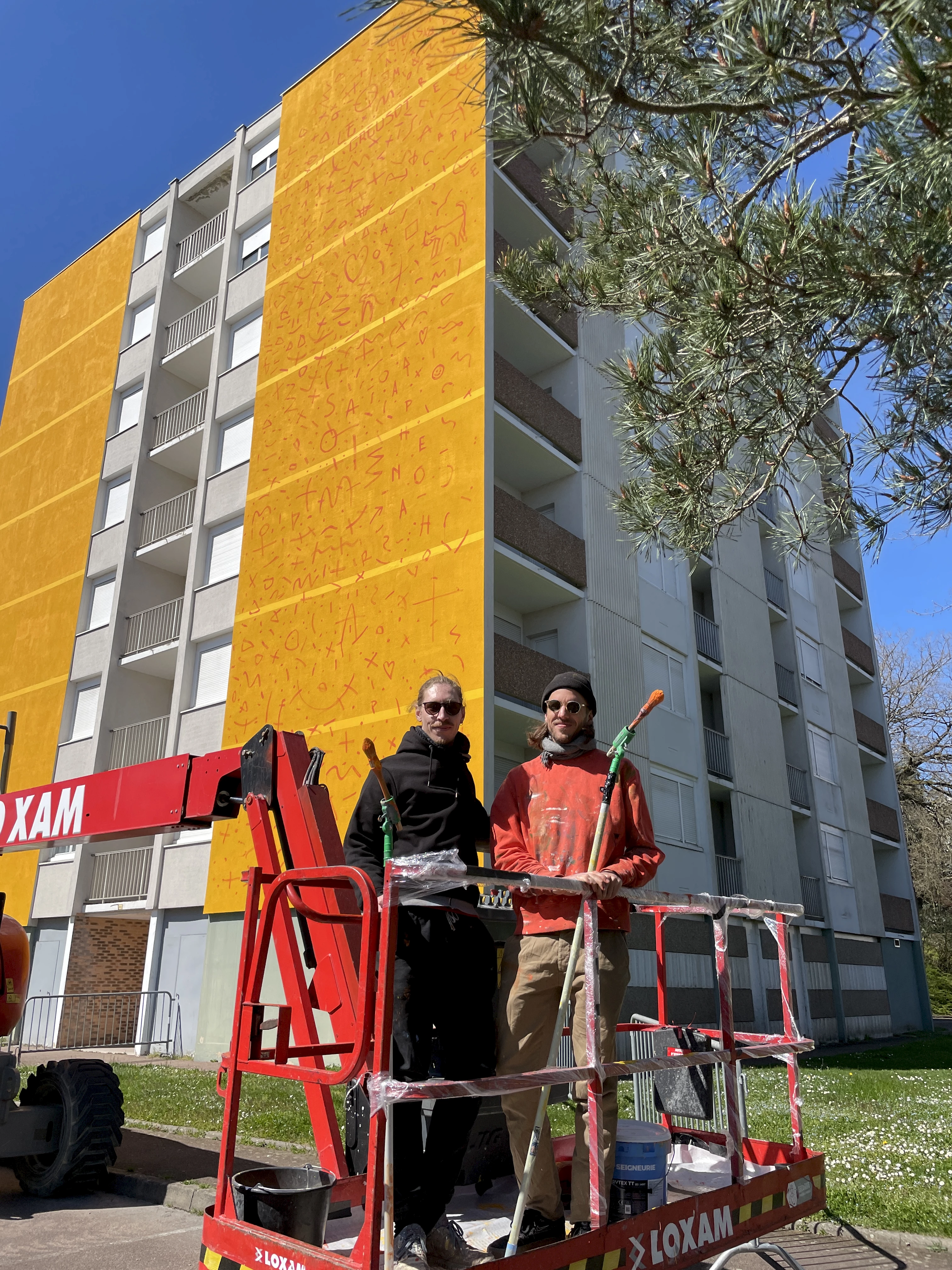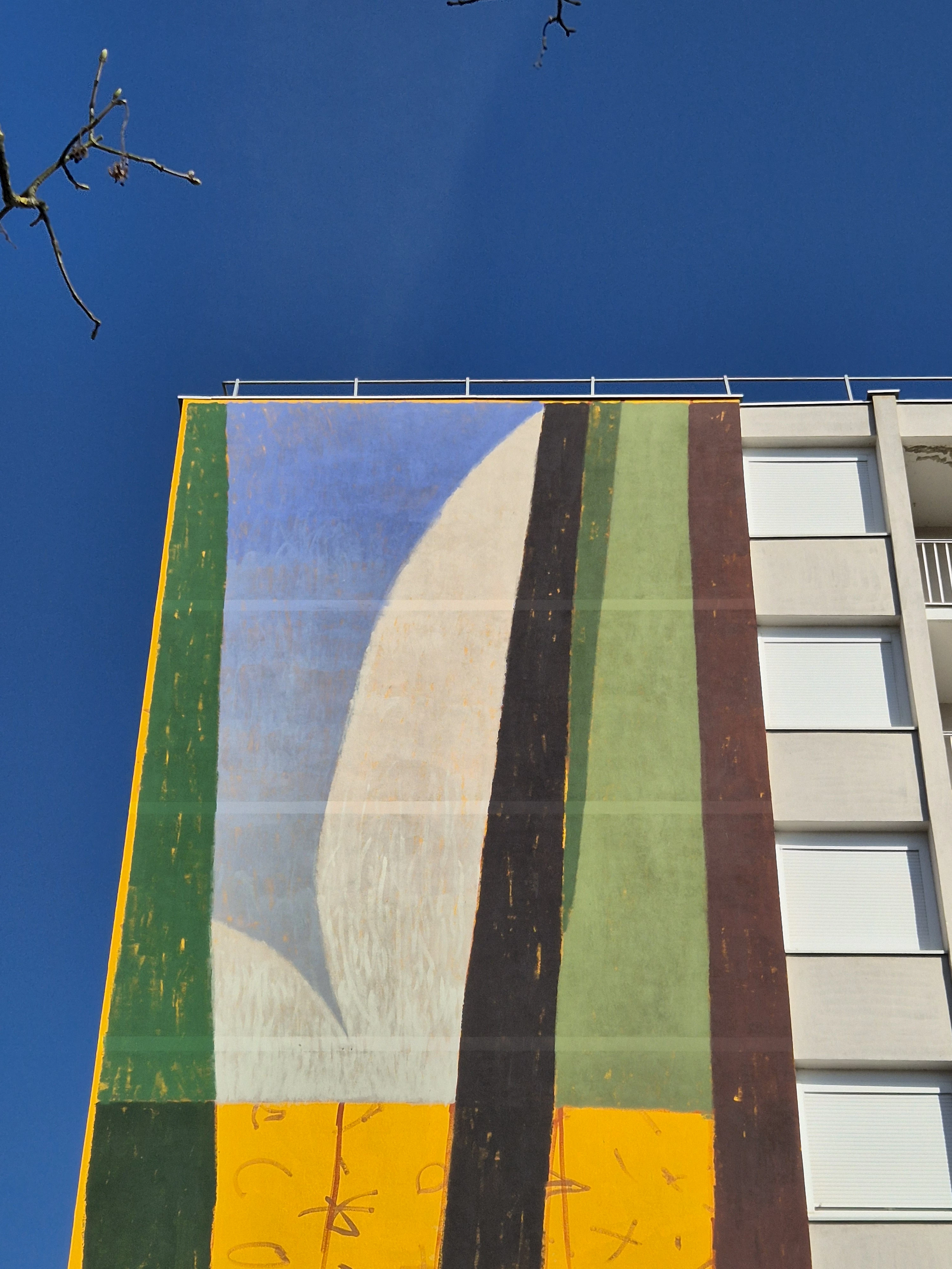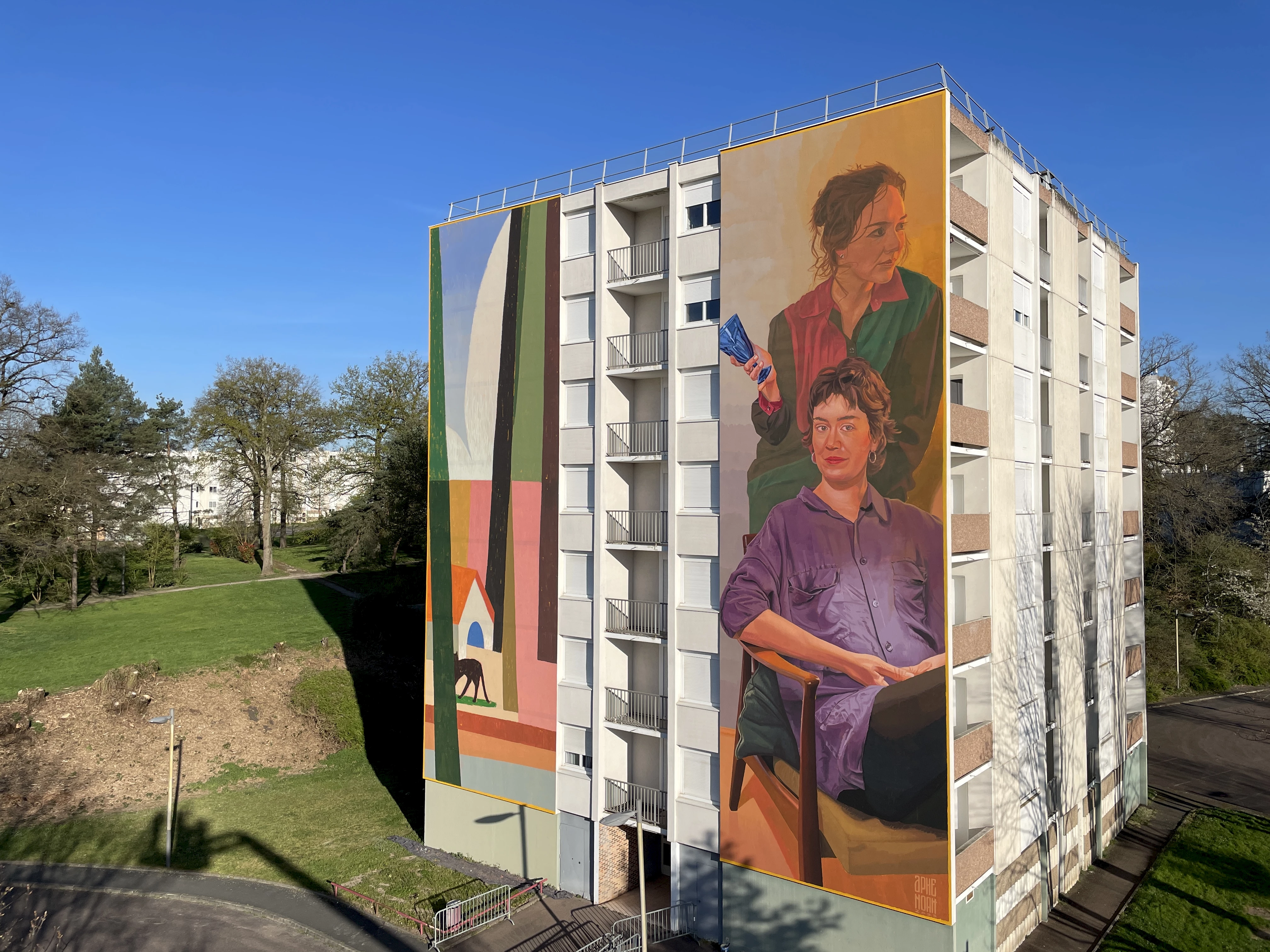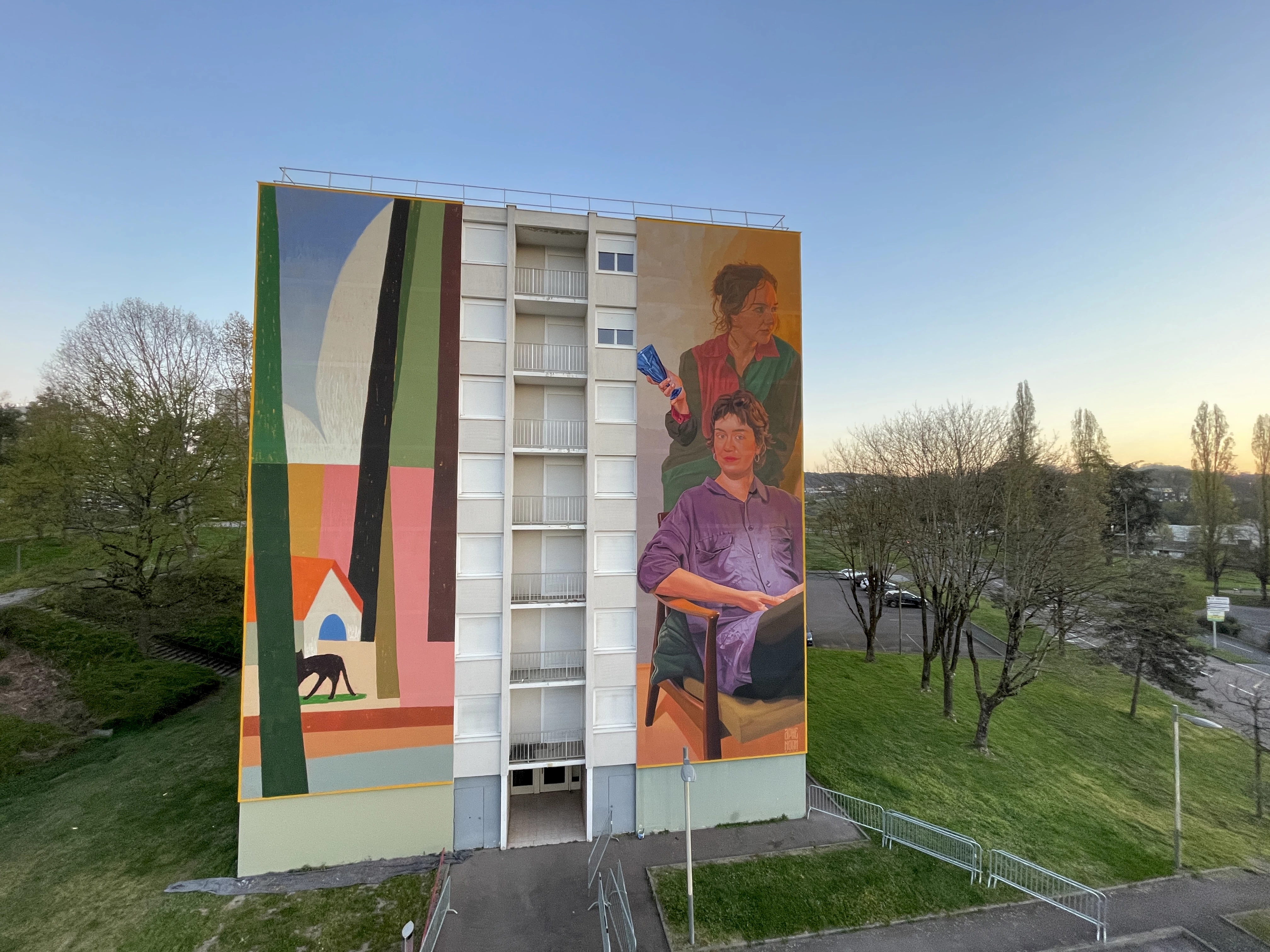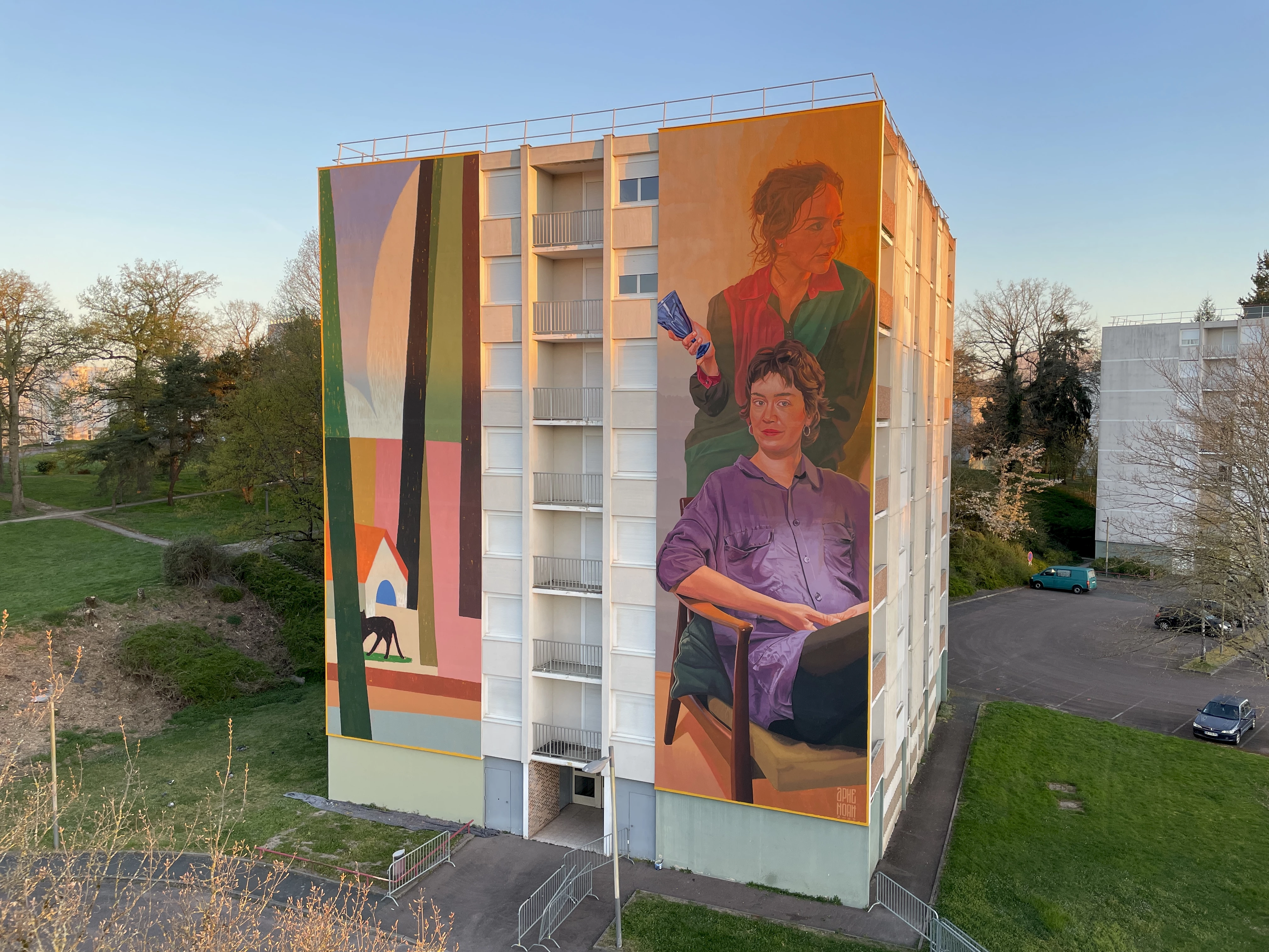 Les artistes ont imaginé une œuvre duale pour cette façade monumentale. D’un côté, deux jeunes femmes habitent un intérieur. L’une d’elles tient un verre bleu à la main, hommage aux collections de cristallerie de l’Écomusée du Creusot, ce qui a inspiré le titre de l’œuvre. L’attitude de ce duo est paisible et accueillante. Sur l’autre pan de façade, un paysage tendant à l’abstraction est inspiré de la végétation présente dans le quartier, et en particulier de sa belle pinède. L’harmonie des couleurs lie les deux parties de l’œuvre, dont la chaleur égaye cette entrée de ville.