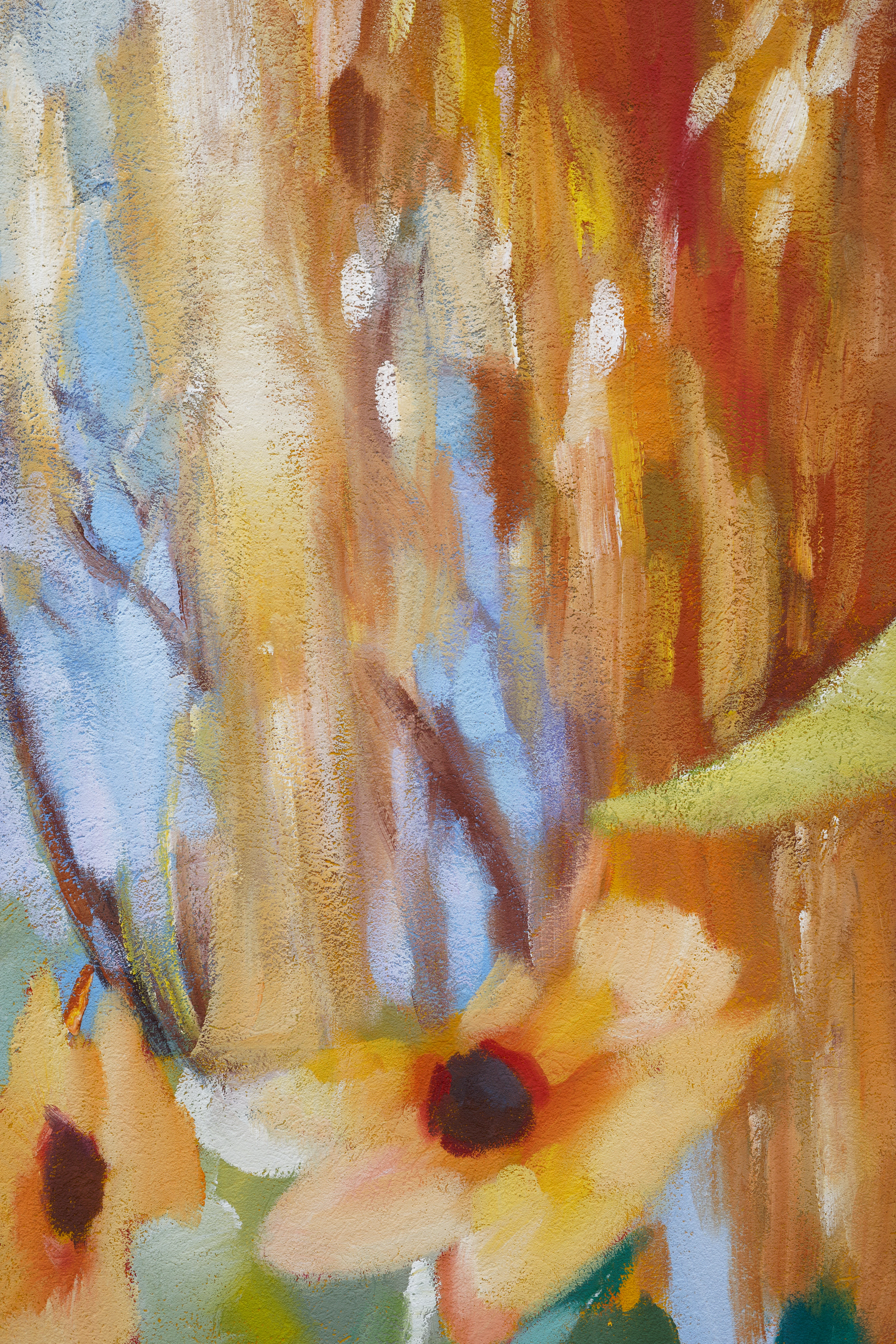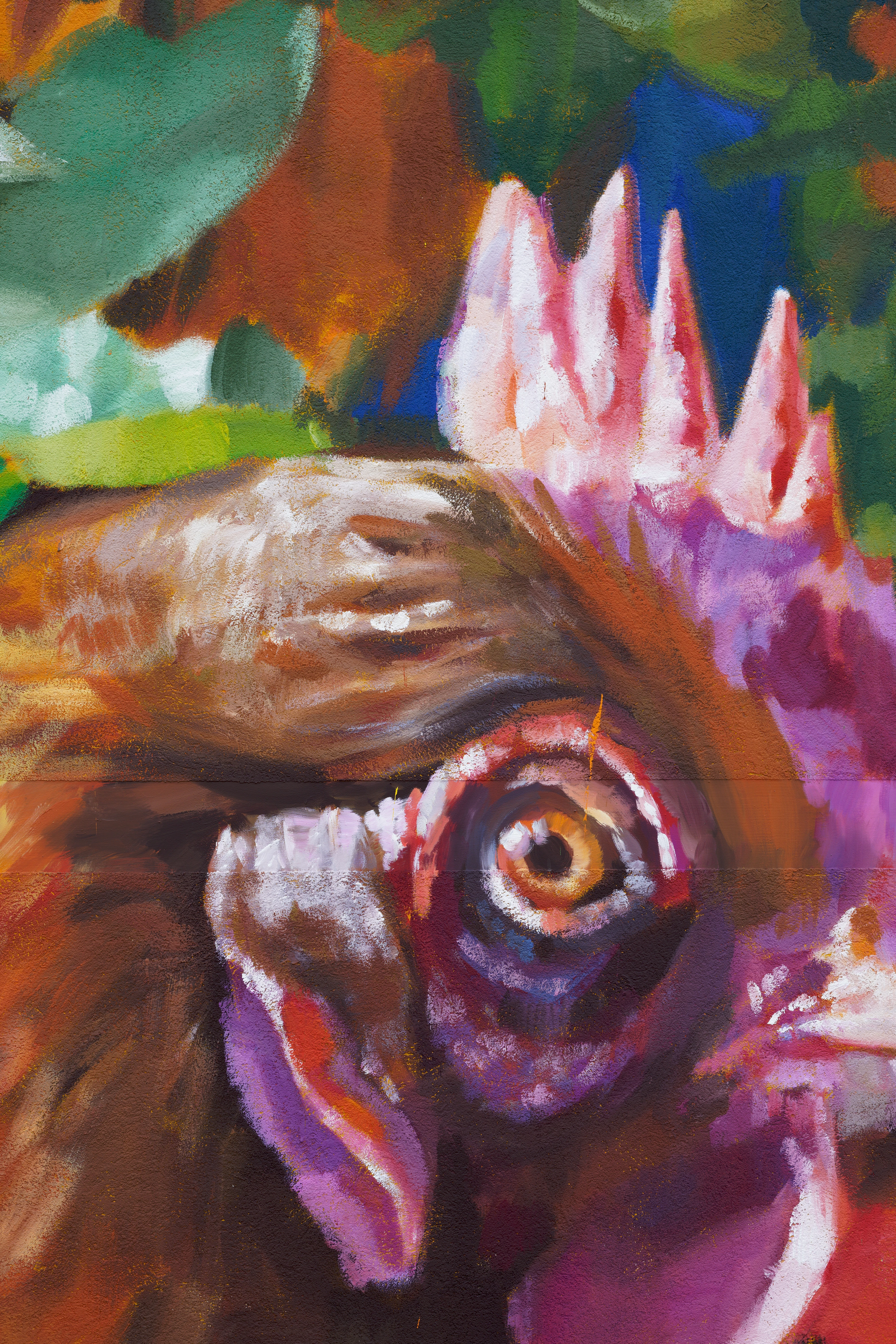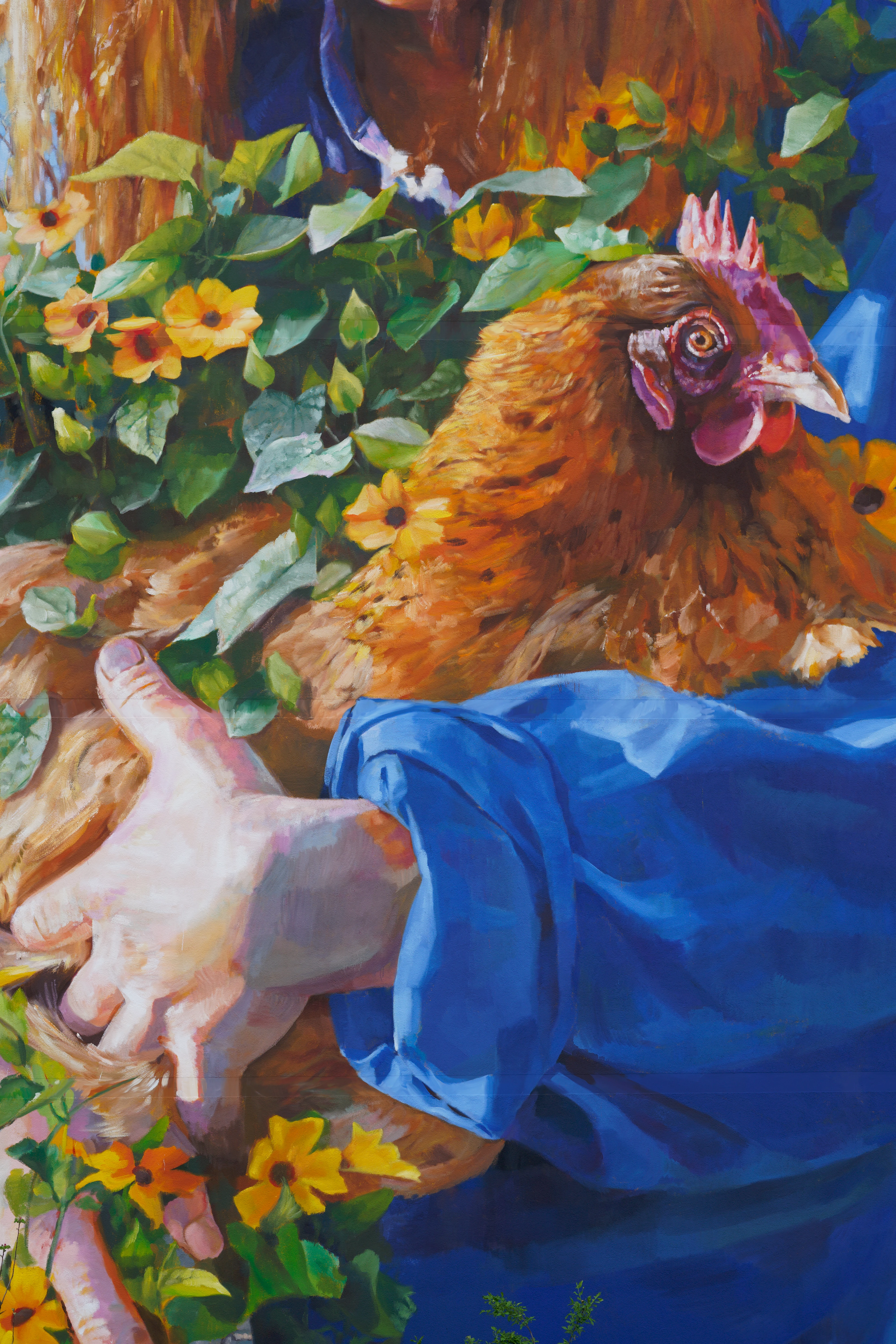 Face au jardin nourricier, l’artiste a peint une scène d’amitié entre l’humain et l’animal. Cadrée de façon serrée, une poule est tendrement portée par une jeune femme vêtue d’un bleu de travail. Cette scène intense nous parle de l’importance de notre relation avec l’environnement, animal, végétal, terrestre en général. Implanté depuis quelques années sur le quartier, le jardin nourricier est une petite parcelle où s’exprime cette relation. Le titre nous informe sur les êtres qui peuplent la scène : Cécile est le modèle qui a posé pour l’artiste. Suzanne renvoie à la Suzanne aux yeux noirs, l’espèce florale représentée et cultivée au jardin nourricier. Quant à Eugénie, il s’agit de l’une des poules qui vit au potager.