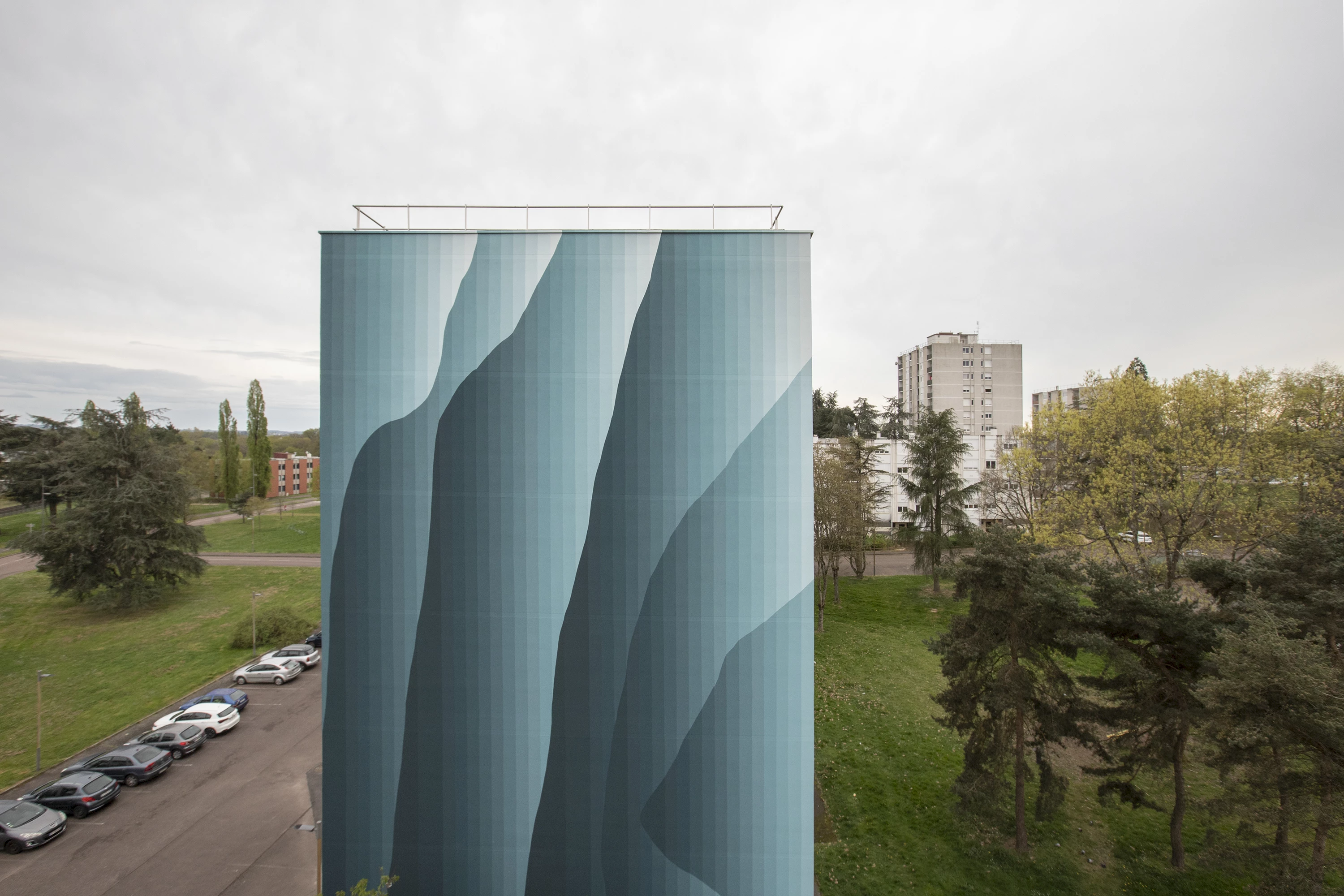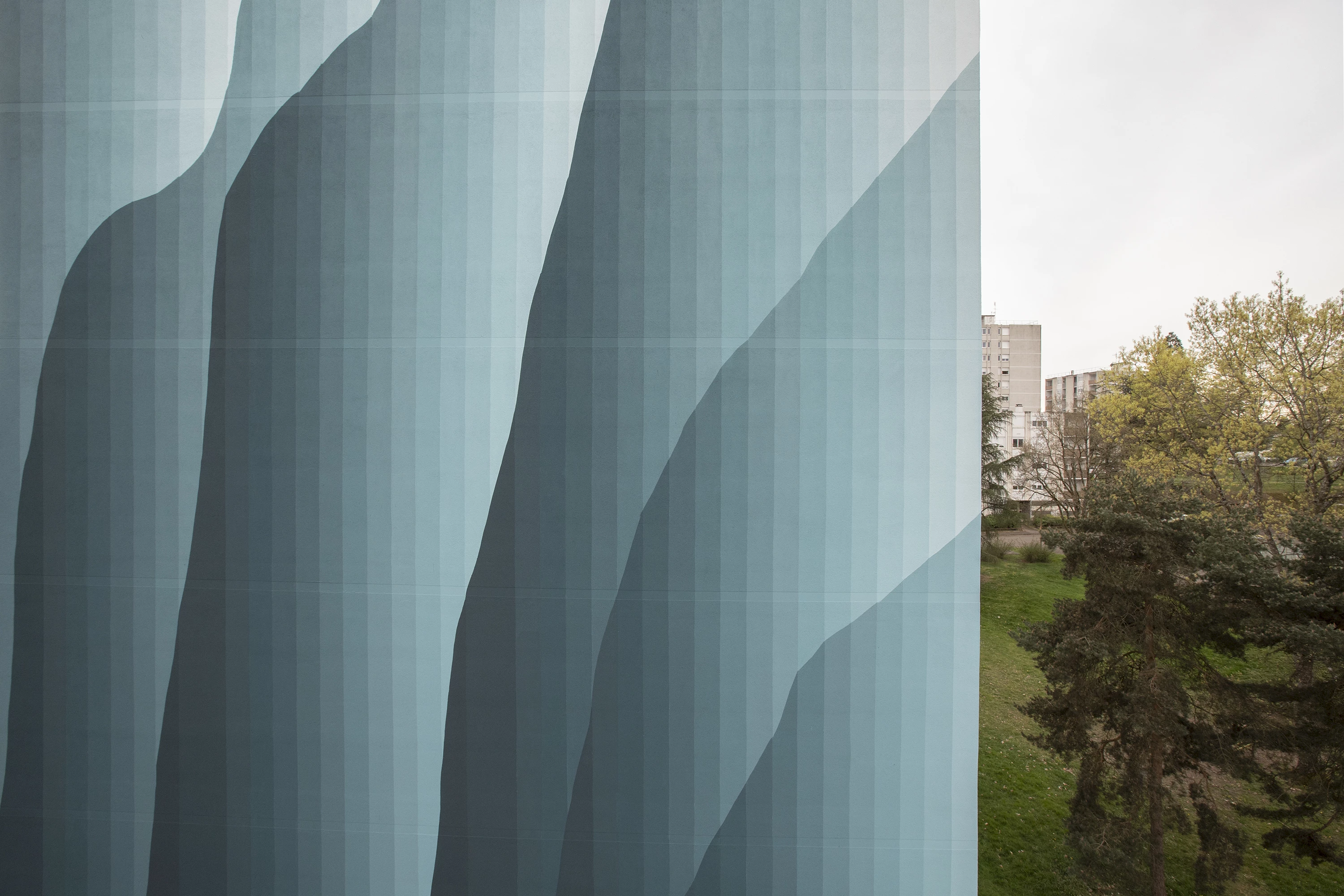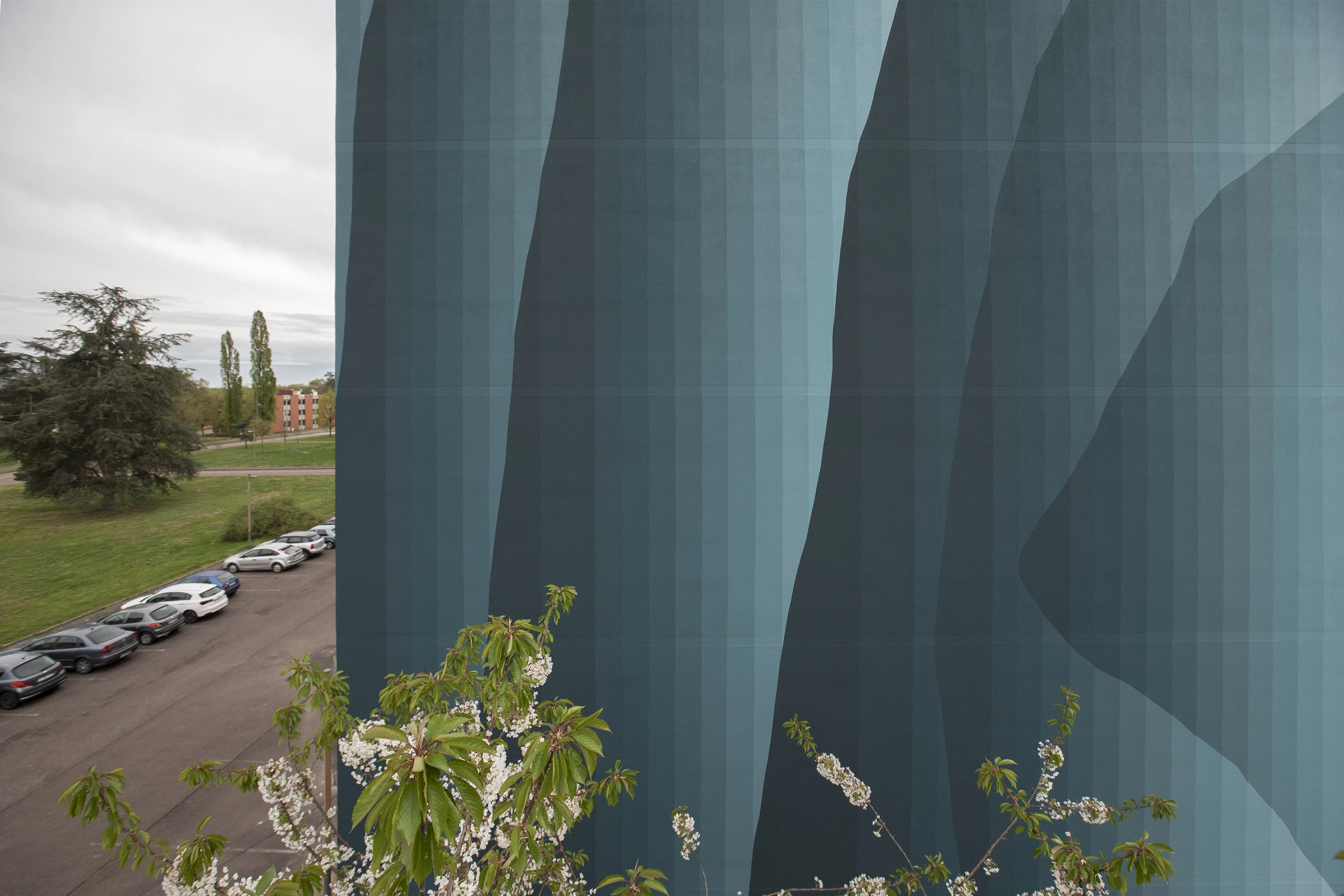 Roberto Ciredz crée un effet de trompe-l'œil étonnant, qui se fond dans le paysage arboré du quartier. L’artiste décline la couleur vert, du foncé au très pâle. Interpelant le spectateur, les dégradés produisent des effets de volumes saisissants, qui semblent alléger cette façade massive. À travers ces formes, Roberto aborde le sujet de la nature vivante : la croissance des végétaux, le mouvement des vagues ou des nuages. Les lignes verticales, elles, évoquent la main de l’Homme, droite et scientifique. L’ensemble est harmonieux, comme une relation idéale entre l’humain et l’environnement.