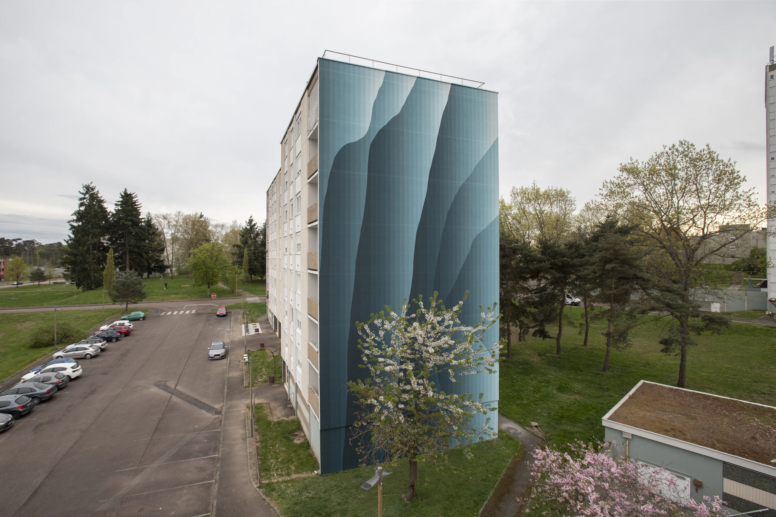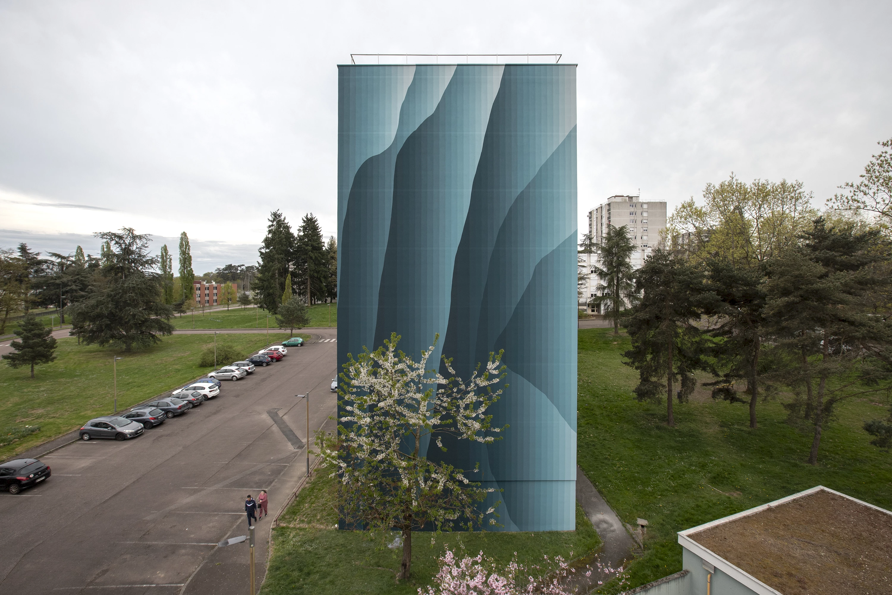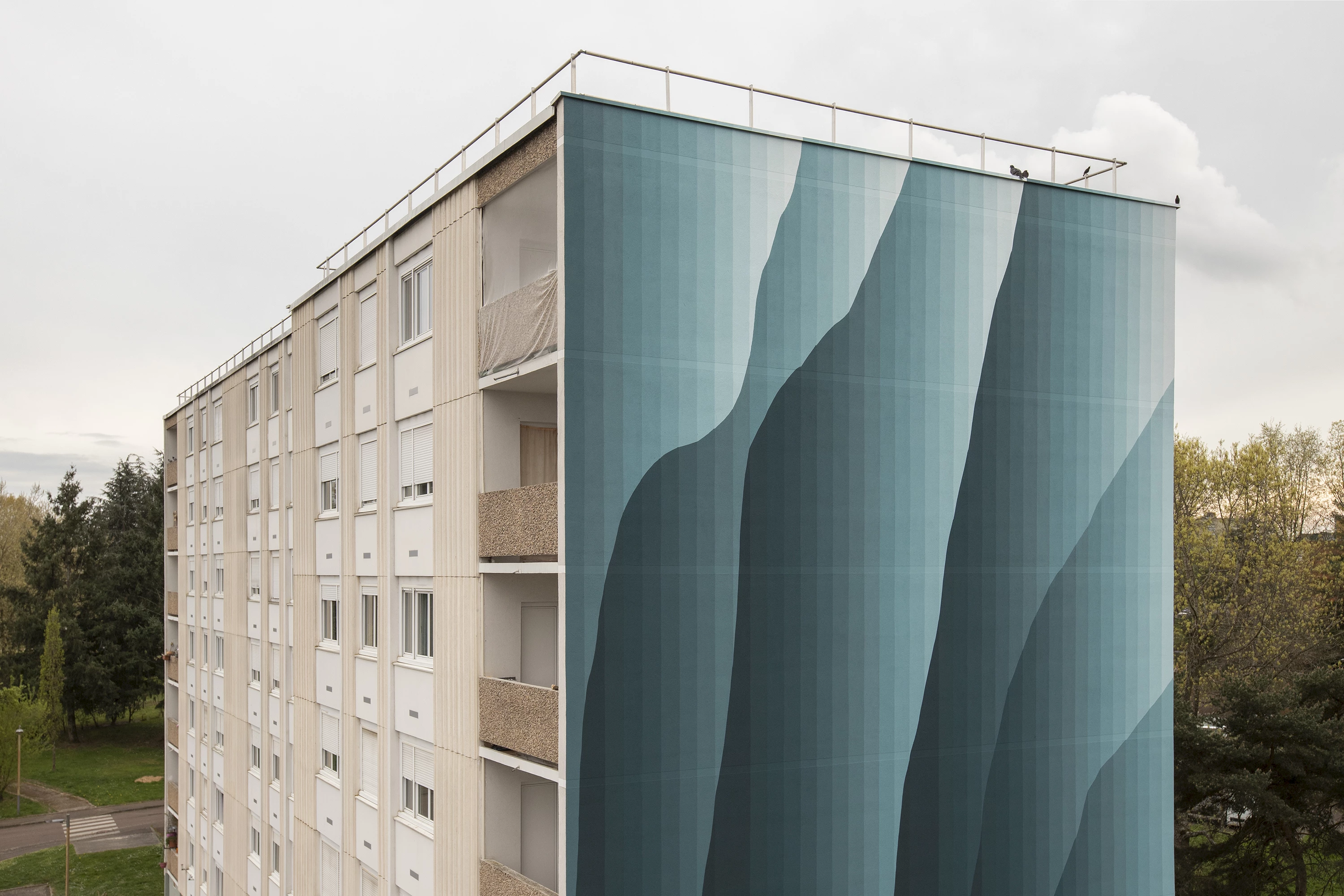 Roberto Ciredz crée un effet de trompe-l'œil étonnant, qui se fond dans le paysage arboré du quartier. L’artiste décline la couleur vert, du foncé au très pâle. Interpelant le spectateur, les dégradés produisent des effets de volumes saisissants, qui semblent alléger cette façade massive. À travers ces formes, Roberto aborde le sujet de la nature vivante : la croissance des végétaux, le mouvement des vagues ou des nuages. Les lignes verticales, elles, évoquent la main de l’Homme, droite et scientifique. L’ensemble est harmonieux, comme une relation idéale entre l’humain et l’environnement.