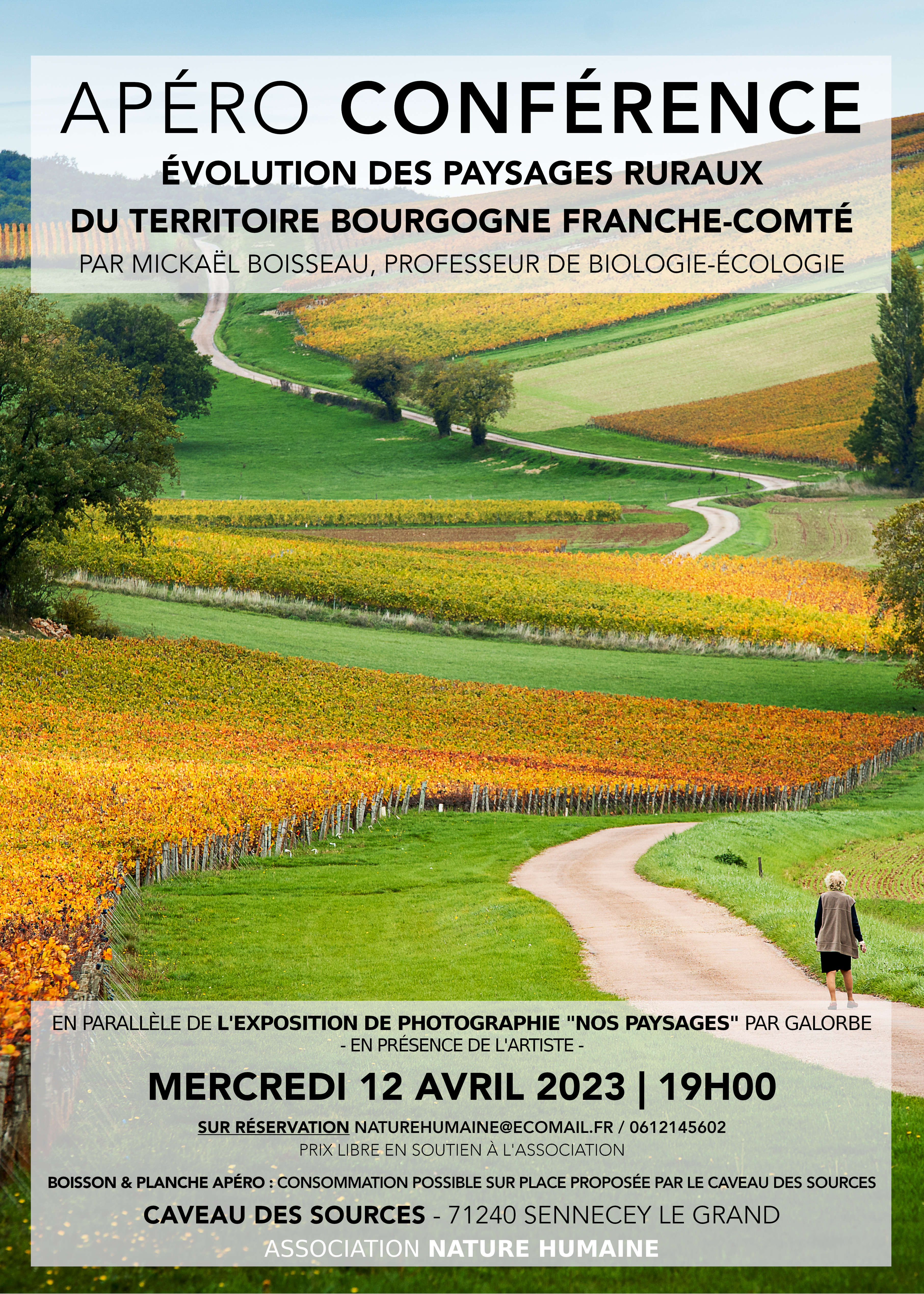 Le seconde apéro-conférence a eu lieu en avril 2023. En parallèle de l'exposition "Nos Paysages" du photographe Galorbe, nous abordions le thème de l'évolution des paysages ruraux en Bourgogne-Franche Comté.